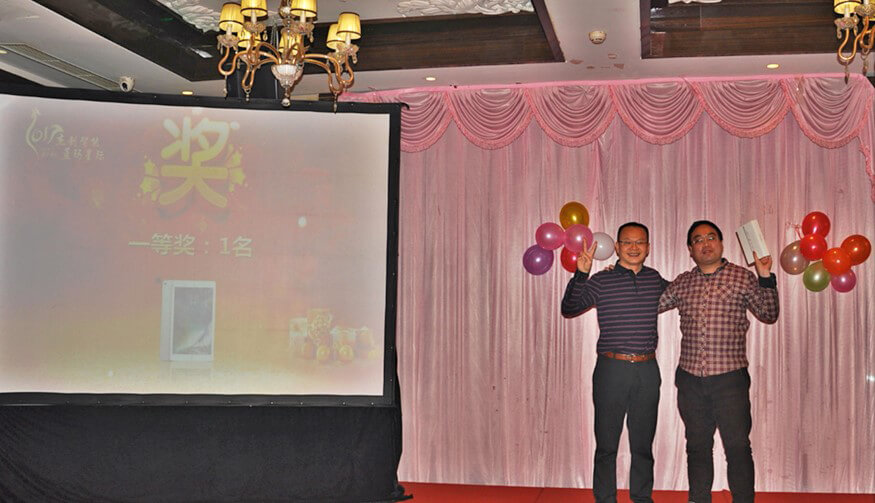 作为年会的主要环节,颁奖典礼特别隆重喜庆、激动人心。蓝玛星际和hth.com华体会智能北京分公司的很多员工,在过去一年里,勤勤恳恳,兢兢业业,在工作中取得了优异的成绩。为了表彰他们的敬业精神和突出表现,年会上对他们进行了大力嘉奖。先进集体(研发部)、最佳经理人(张继)、优秀员工(张春晓、董学慧、李晓林、马栋、李海云、刘盼、杜飞)、优秀实习生(肖坚星),在全场人员的热烈掌声和称赞中接受了表彰和奖励。